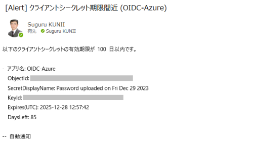スクリプトは実行されると、期限が切れそうなクライアントシークレットを見つけ、こんな感じでメールが送られてきます。
