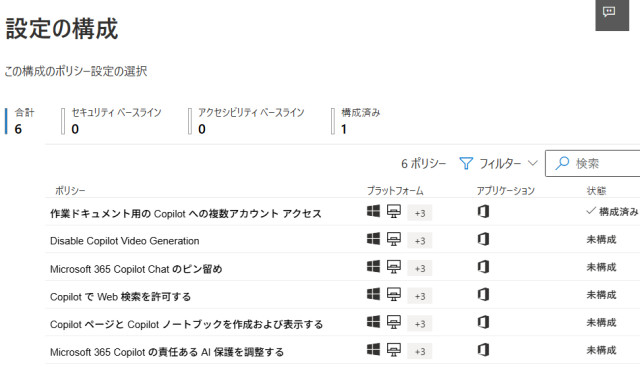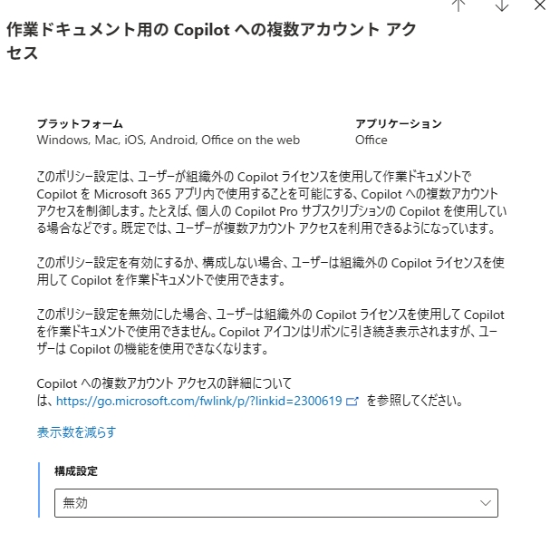 Microsoft Intune管理センターから アプリ > Microsoft 365 アプリのポリシー にアクセスし、新しくポリシーを作成します。そして、ポリシー画面で [作業ドキュメント用の Copilot への複数アカウント アクセス] を開いて