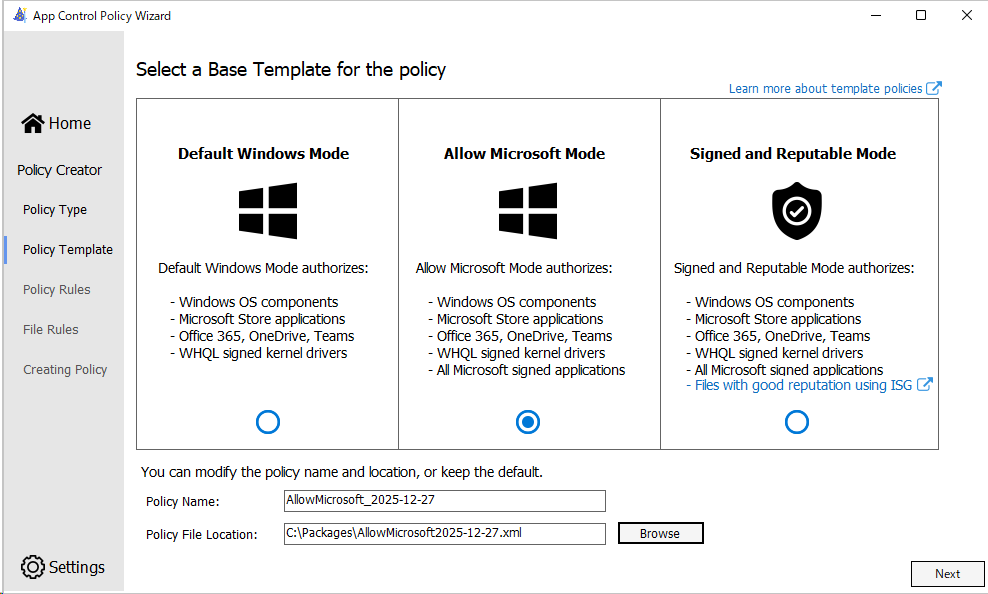 この画面ではどこまでのアプリケーションの実行を許可するかを定めたポリシーの種類で、左は既定のアプリケーションのみ、中央はマイクロソフト製アプリのみ、右は ISG によって信頼されたアプリのみ実行許可という分類になっています。どれを選ぶとどこまでの実行が許可されるか?の詳細は MS Learn サイトに説明があるので参考にしてください。