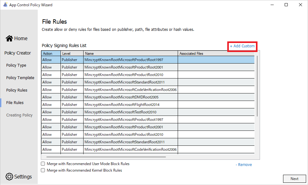 話を進めましょう。ウィザードをさらに進めるとどの発行元から発行された署名を持つアプリの実行を許可するか?という画面が出てきます。他のものも許可したければ Add Custom を選択すれば追加できます。Add Custom を使うと発行元を指定したり、特定のフォルダーに入っているアプリの実行を追加で許可したりすることができます。