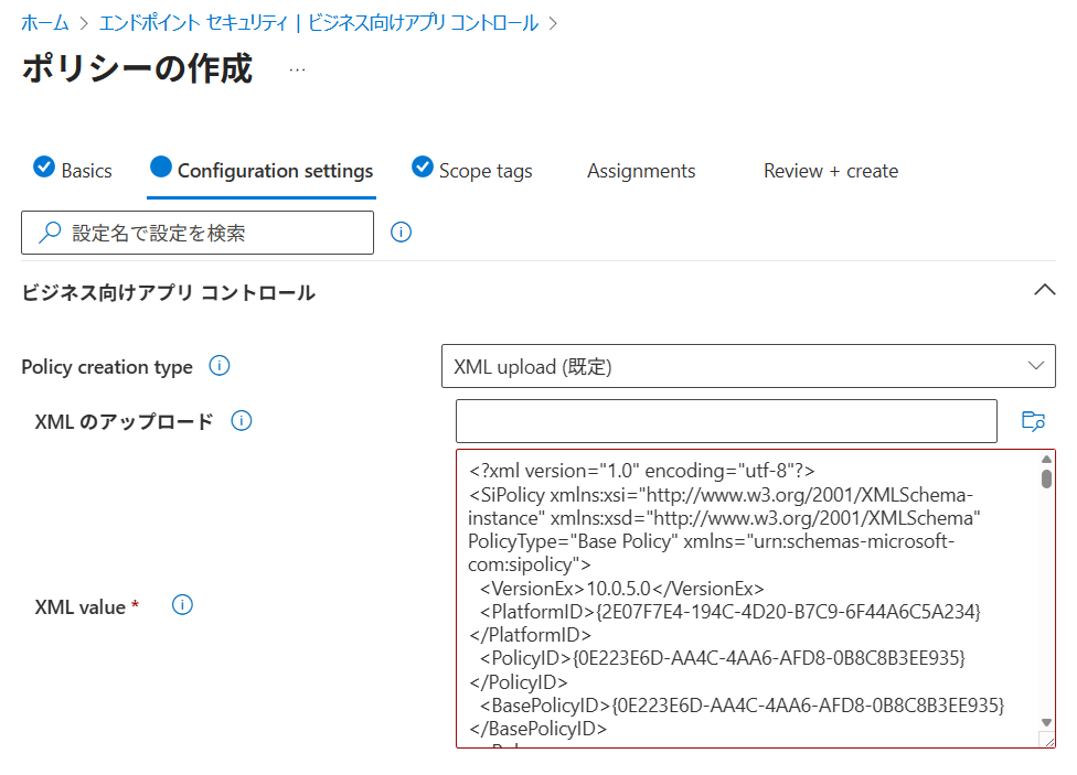 以上の設定ができたら XML ファイルができあがるので、これを Intune 管理センターの