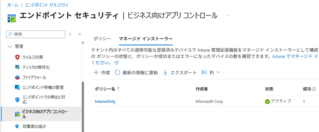 ポリシーができたら、マネージドインストーラータブから [Intune マネージド拡張機能をマネージド インストーラーとして有効にする] という設定も有効にするポリシーを同時に作成してください。