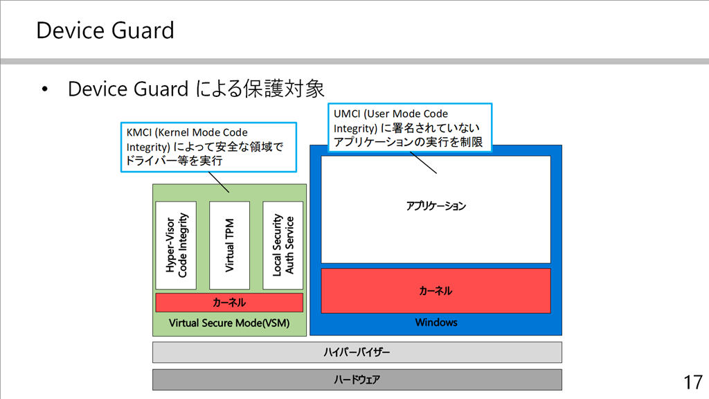 もうちょっとだけ細かい話をすると Device Guard にはカーネルモードで実行するドライバーなどをチェックする仕組みである KMCI と、アプリケーションの実行をチェックする仕組みである UMCI があり、どちらも HVCI のテクノロジーを利用して実現するものになっています。