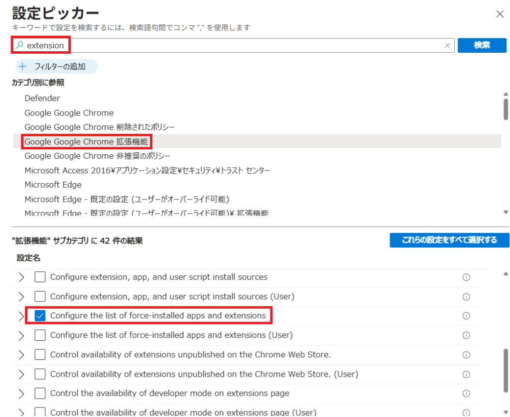 Microsoft Intune管理センターからデバイス > 構成 > ポリシーの作成 から設定カタログを作成します。ウィザードを進めていくと設定の追加ボタンが出てくるので、設定ピッカーからextensionと入力して、候補から Google Chrome 拡張機能 > Configure the list of force-installed apps and extensions の順に選択します。