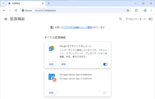 ポリシーが割り当てられたデバイスのChromeを開くとこんな感じ